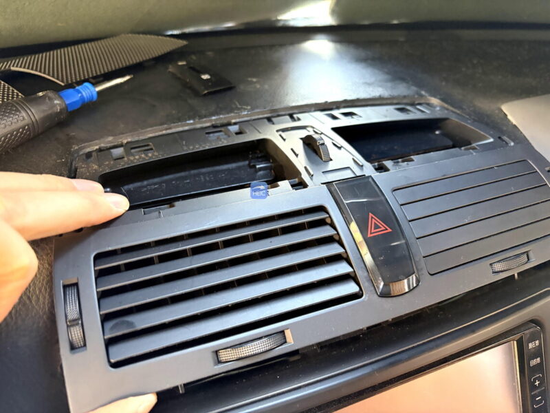 フロントエアコンを取り外す必要がある。通気口の部分が割れやすいので慎重に外す必要あり。