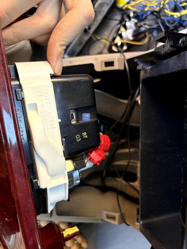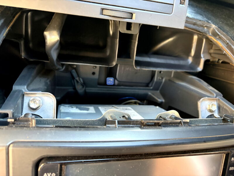 この下の写真のネジ。レンチを入れるのが結構むずいがこれを外したら、ようやくナビを外し、ナビ裏の配線が確認できる