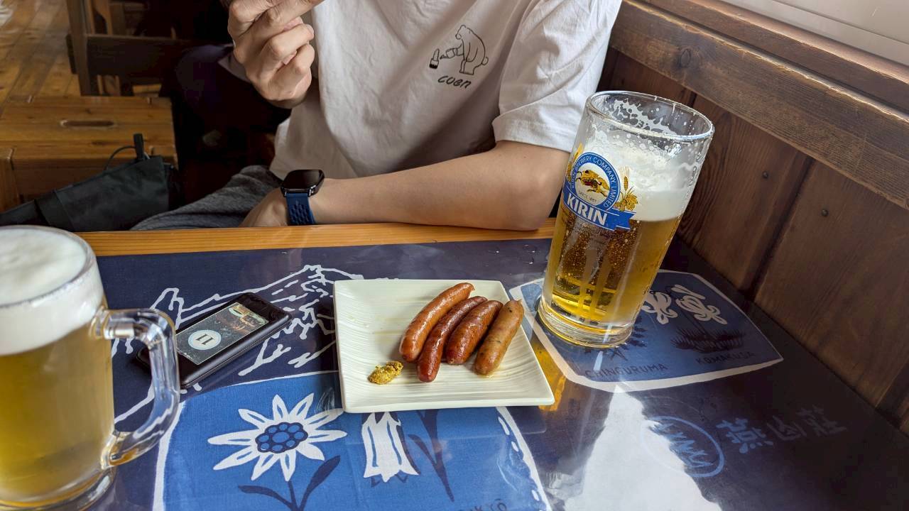 燕山荘はビールやつまみが買える。1日目の行程終ったので、明るいうちから生ビールとつまみを頼んでリラックス。