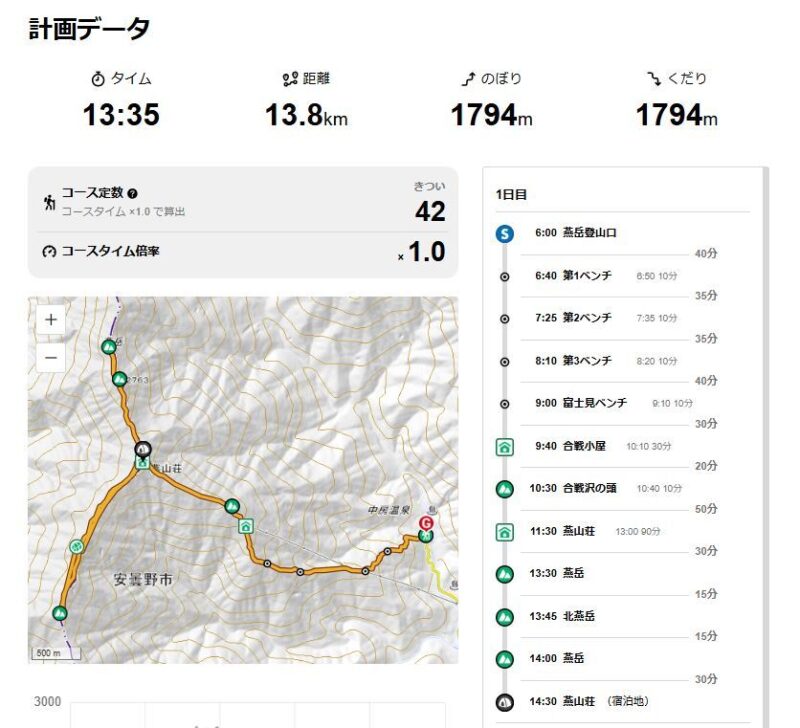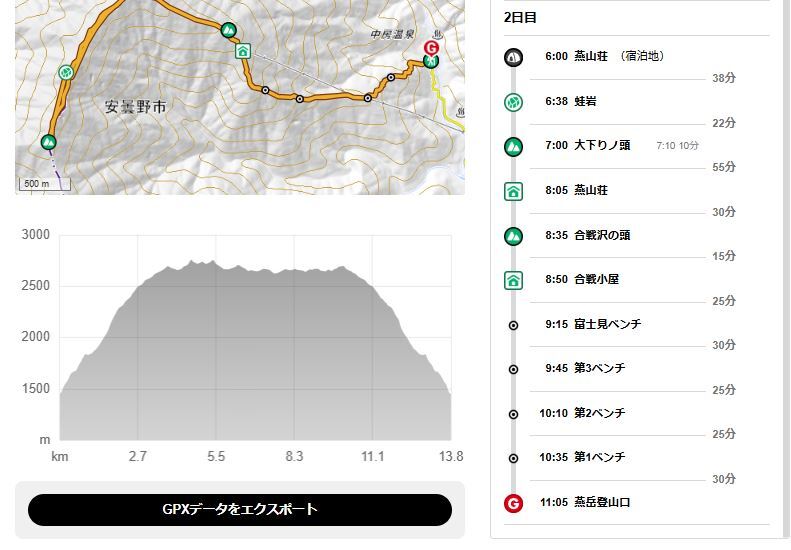 YAMAPより。夜行バスで朝一に中房温泉登山口に行き、早朝から登山開始。1日目は燕山荘泊にし、余力があれば燕岳、北燕岳を登る。2日目はパノラマ銀座を大天井岳方面へ少し歩き、蛙岩、大下りの頭まで行ってからピストンで下山の予定。